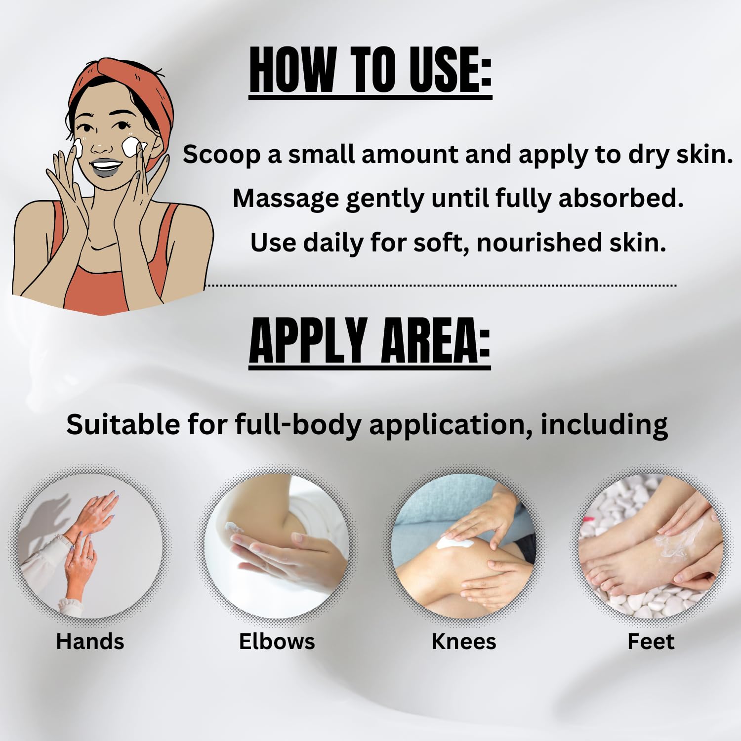 - Massage generously onto clean, dry skin—especially on rough or dehydrated areas.