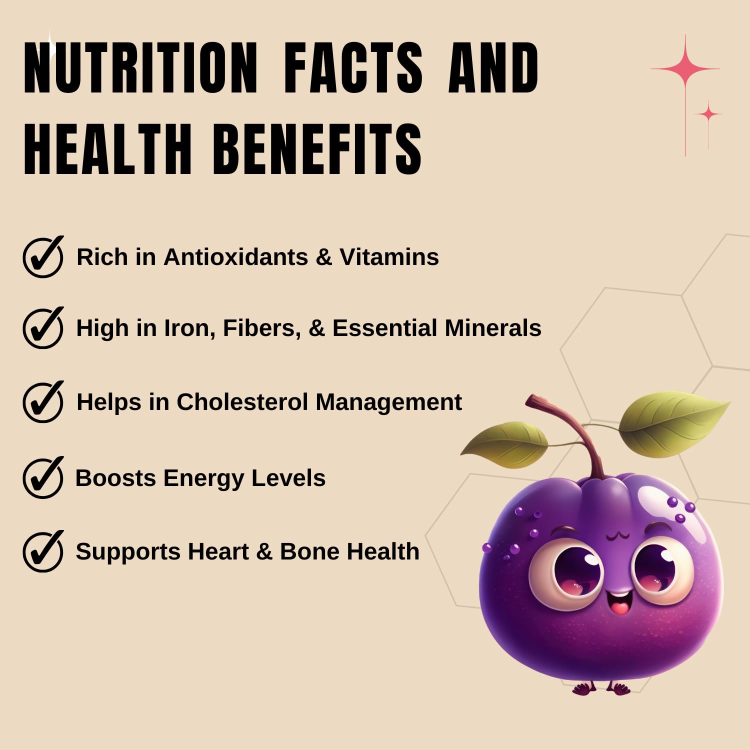 POWERHOUSE OF NUTRITION: Dharitri Kashmiri plum berries are loaded with dietary fiber, iron, vitamins A and K, and essential minerals like potassium and magnesium, offering a nutrient-dense snack option. These prunes support overall wellness and are an excellent choice for a nutrient-dense diet