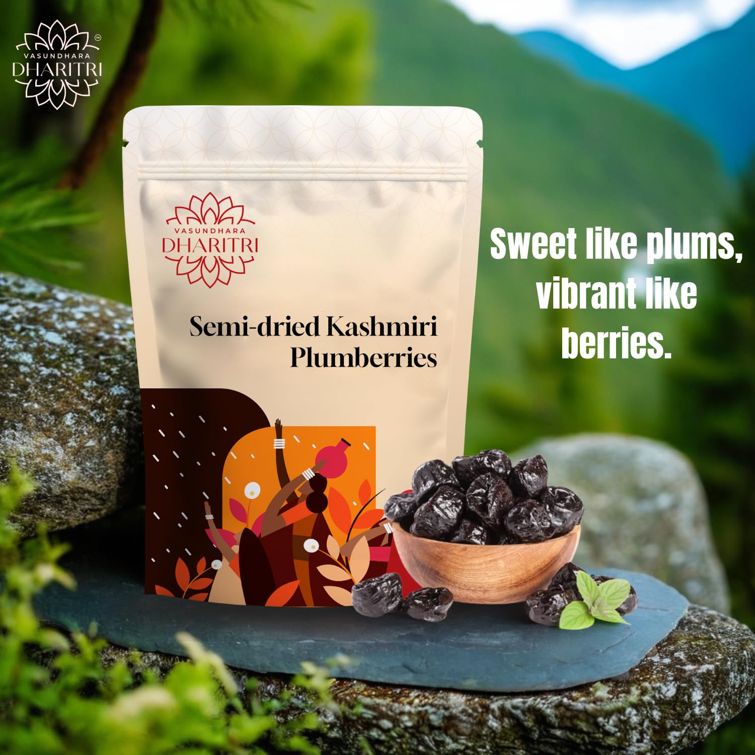 The texture of our Kashmiri Semi-Dried Plumberries is a perfect balance between the chewiness of dried fruits and the succulence of fresh berries. Their rich, deep hue is a testament to the untouched beauty of their origin, and their flavor is an enchanting blend of sweet and tangy notes with a hint of earthiness that is characteristic of the Kashmiri terroir. These versatile fruits are ideal for elevating your morning cereal, adding a sophisticated touch to cheese platters, or simply enjoying straight from the bag as a wholesome snack. They pair beautifully with both sweet and savory dishes, making them an essential ingredient for adventurous chefs and food enthusiasts alike.